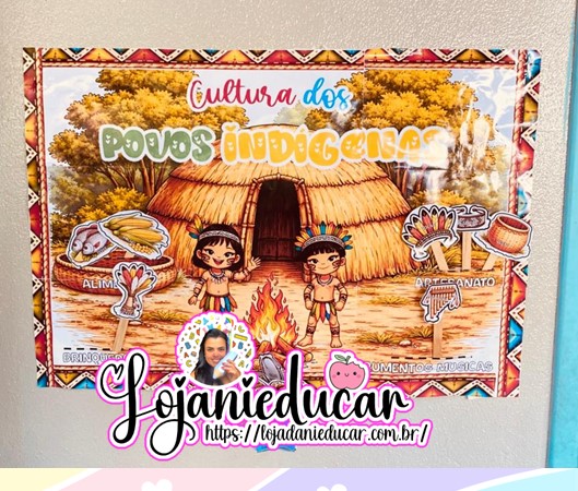 1 painel tamanho 2×2 colorido para anexar elementos da cultura indígena: brinquedos, alimentos, instrumentos musicais e artesanato.